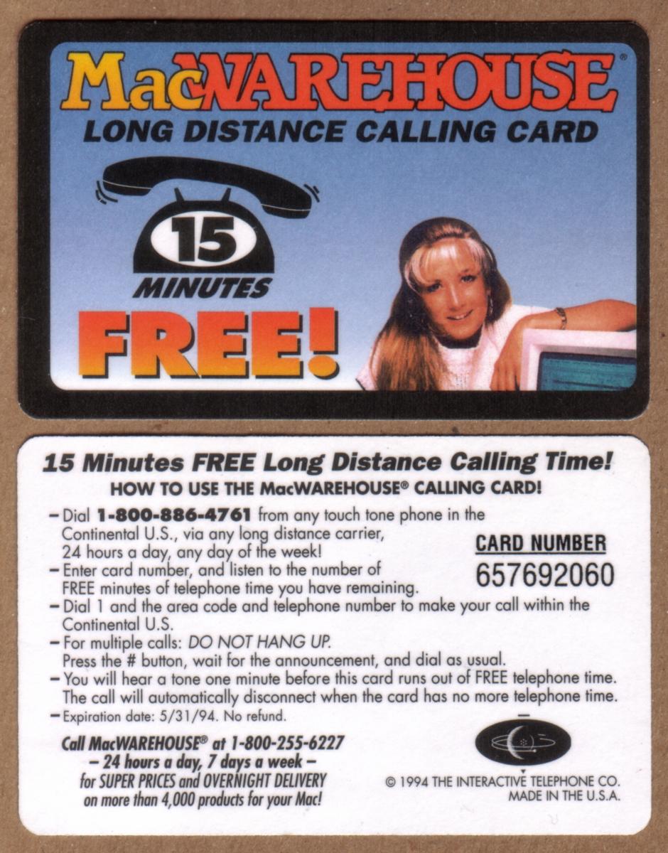 Overall, the card combines imagery of the Apple Macintosh computer with promotional text that underscores its association with MacWarehouse and telephone service, making it a collectible item for technology and Apple enthusiasts.