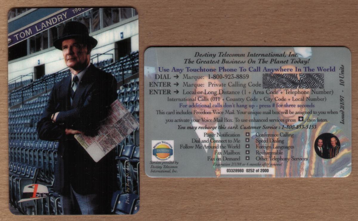 This item is issued by Destiny Telecomm and is a collectible football-themed phone card. It highlights one of the most iconic figures in NFL history, Tom Landry, with clear references to professional football, the Dallas Cowboys, and the Pro Football Hall of Fame. The imagery and text celebrate both the coach and his team, making this collectible card a tribute to NFL football heritage.