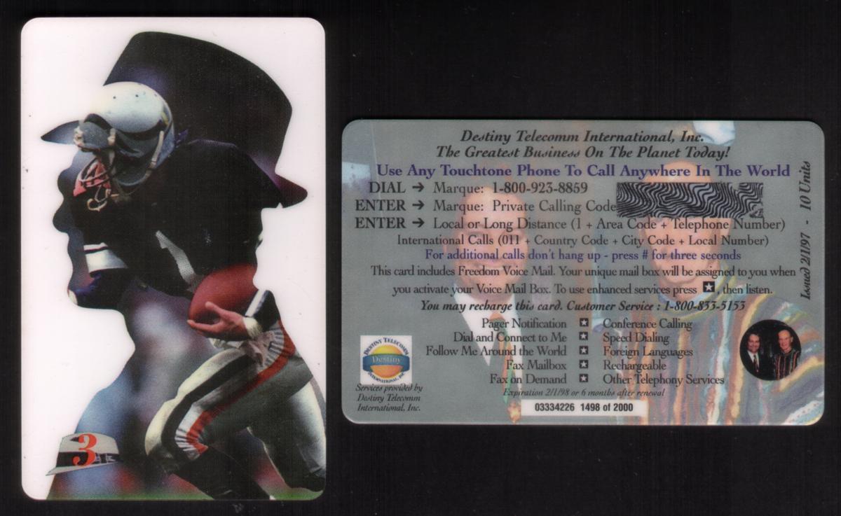 The card prominently includes the name "Tom Landry" and references the Pro Football Hall of Fame, underscoring Landry’s inducted status and his impact on the sport. The Dallas Cowboys team affiliation is clearly integrated through colors and logos associated with the franchise. The card visually connects the themes of football coaching, player dedication, and the professional excellence celebrated by the NFL. The design also incorporates the word "Destiny Telecomm," indicating the telecommunications company linked to this collectible phone card.
