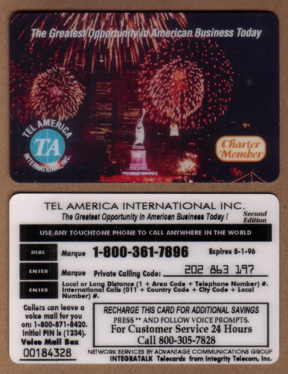 The card includes branding and names such as Tel America International, Destiny Telecomm International, MCI, Integrity Telecom, Integratalk, Advantage Communications Group (ACG), and mentions Tel America Charter Member. The text "the greatest opportunity in american business today" appears prominently, reinforcing the card's connection to American business and telecommunications services.