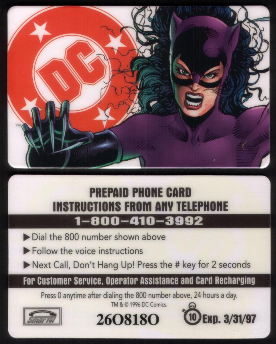 Overall, this phone card exemplifies a collectible item combining popular comic book culture with telecommunications memorabilia, featuring clear references to Catwoman and DC Comics, alongside the promotional and monetary value markings specific to the card’s use within SmarTel Communication’s network.