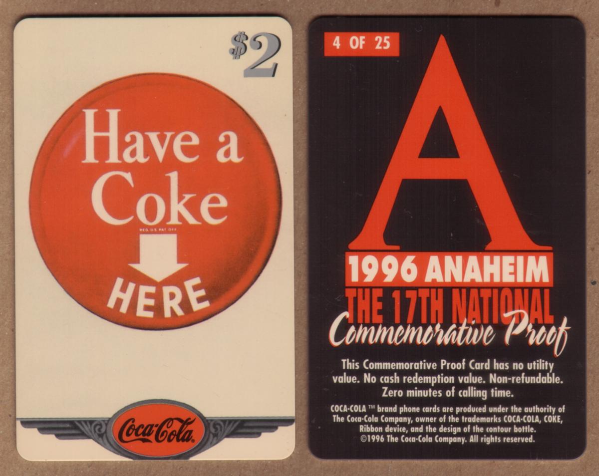 This collectible item is a 1996 Coca-Cola $2 commemorative proof card issued for the 17th National event in Anaheim. The card prominently features the classic Coca-Cola logo along with “Have A Coke Here” signage, emphasizing the iconic branding of The Coca-Cola Company. The design highlights the “Coke National ‘96” celebration, making it a notable piece for collectors and fans of Coca-Cola memorabilia.