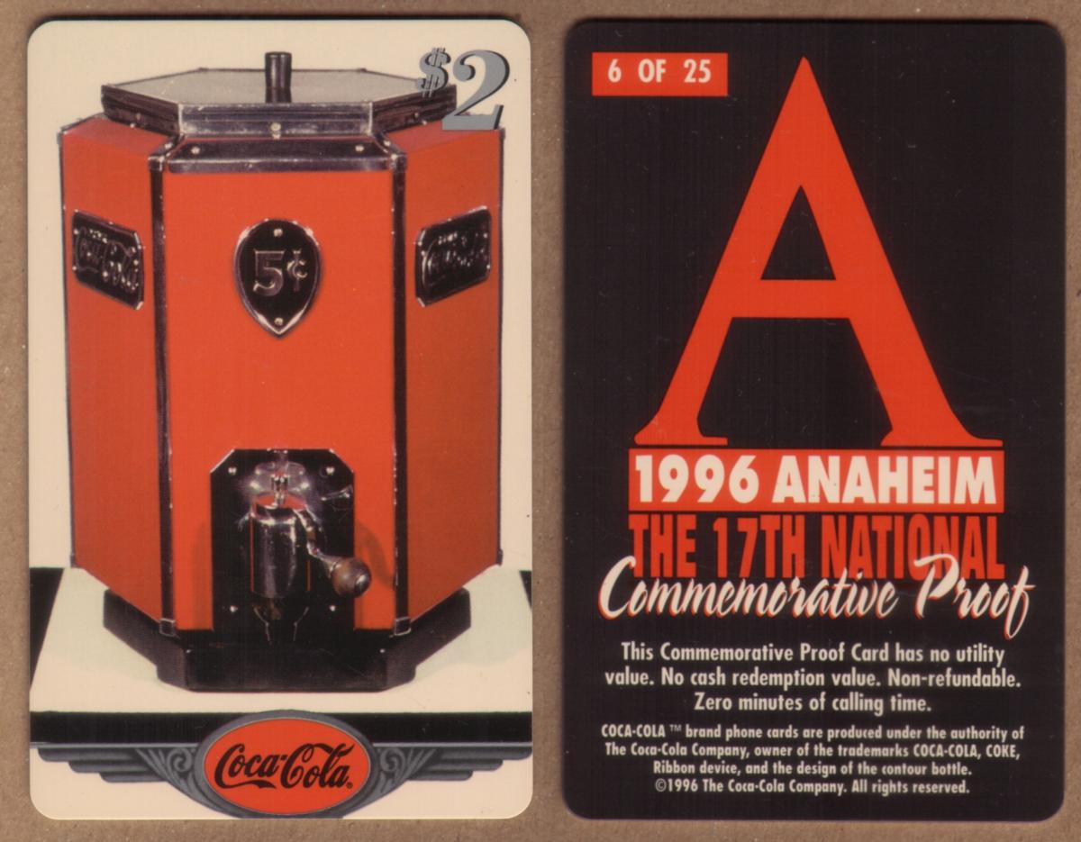 This collectible card features the iconic Coca-Cola brand and commemorates the 1996 Anaheim event known as the 17th National Commemorative Proof Coke National '96. The card prominently displays the Coca-Cola logo with the signature red and white color scheme. Positioned centrally is an old-fashioned Coca-Cola dispenser depicted in realistic detail, highlighting the classic design and metal accents characteristic of vintage Coke dispensers.