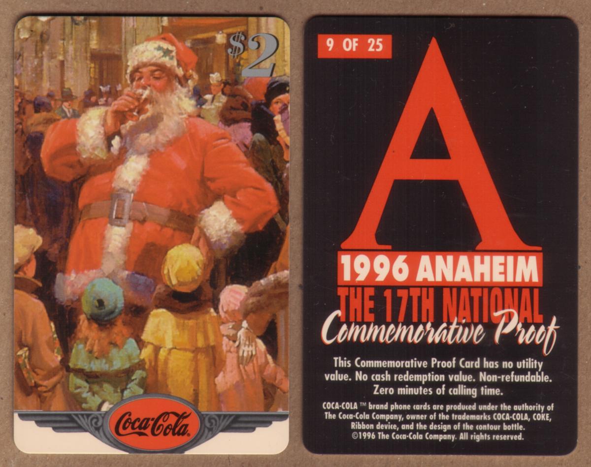 Text on the card includes the phrases "Coca-Cola," "No Time," and the year "1996 Anaheim," referencing the 17th National Commemorative Proof event. The card is marked as "Children Coke National '96 $2. Commem." and includes "#9 of 25 PROOF," indicating it is part of a limited series of commemorative proof collectibles. The Score Board Inc. is credited as the issuer or producer on the card.