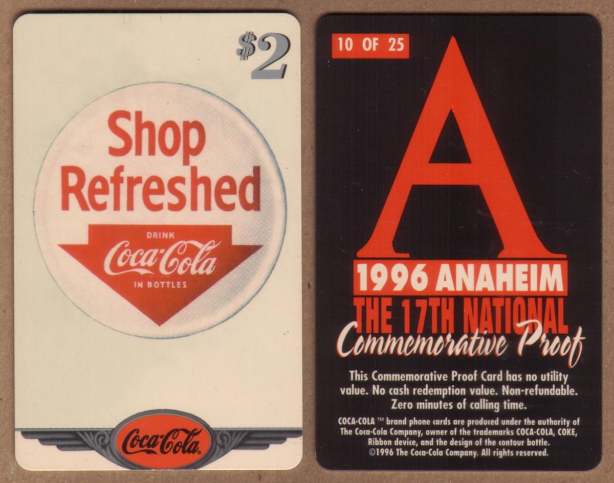 This collectible card features a 1996 Anaheim commemorative design celebrating Coca-Cola and its 17th National Commemorative Proof event. Prominently displayed is the classic Coca-Cola logo alongside the words “Coke National ‘96 $2 Commem.” The card bears the text “Commem. Shop Refreshed Sign.” It is part of a limited edition series, numbered #10 of 25 Proof cards, produced by The Score Board Inc. The design highlights the Coca-Cola Company branding with clear, bold typography.