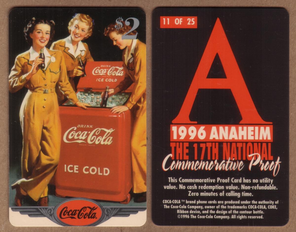 This collectible card features imagery related to The Coca-Cola Company and commemorates the 17th National Commemorative Proof event held in Anaheim in 1996. The front of the card prominently includes the Coca-Cola logo and references three women alongside a Coke cooler. The design emphasizes a vintage or retro style aligned with the iconic branding of Coca-Cola, highlighting this particular collectible as number 11 of a limited edition of 25. The text “Coke National ‘96 $2” reflects its commemorative monetary value and edition significance.