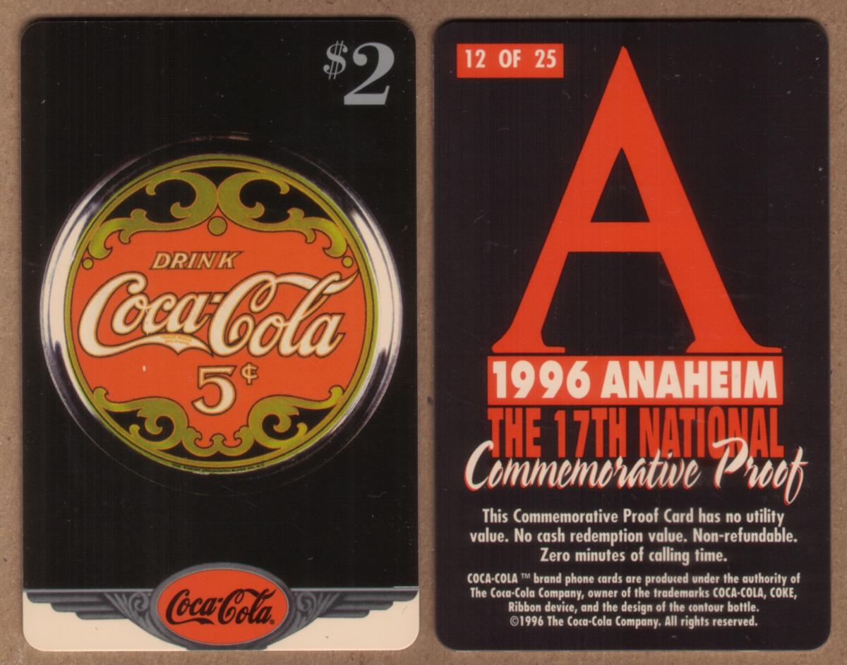 This collectible card features artwork and branding associated with The Coca-Cola Company. The front prominently displays the Coca-Cola logo in bright red and white colors, accompanied by the phrase "Drink Coca-Cola 5¢." The card commemorates the 17th National Commemorative Proof for Coke National '96, held in Anaheim in 1996. The event is clearly noted as "1996 Anaheim" on the front of the card.