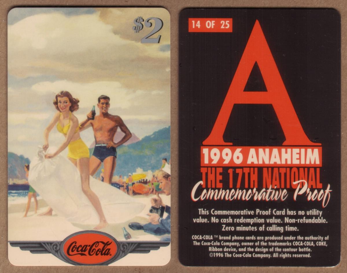 This collectible card features a detailed, colorful beach scene from 1996 with Coca-Cola branding prominently displayed. The image shows a sandy shoreline with a classic Coca-Cola bottle, capturing a summertime vibe associated with the iconic beverage. The card commemorates the 17th National Commemorative Proof Coke National '96 event held in Anaheim. It is labeled as a $2 commemorative proof and is numbered 14 out of a limited edition of 25.