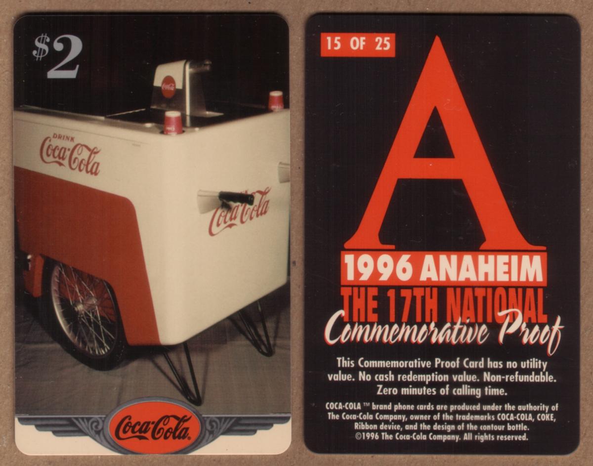 This collectible card features a detailed image of a vintage Coca-Cola dispenser mounted on wheels. The dispenser is painted red with white lettering spelling out "Coca-Cola" prominently on its front and sides. The design of the dispenser includes multiple compartments and a classic styling reminiscent of mid-20th century soda vending equipment. This card commemorates the 17th National Commemorative Proof event held in Anaheim in 1996, as indicated by the text placed on the card’s surface.