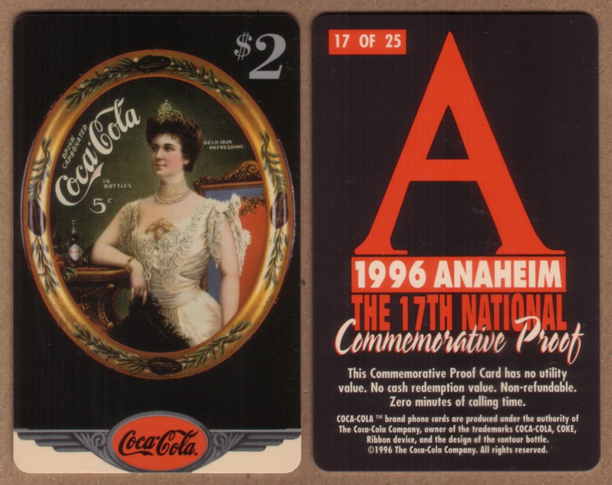 The card bears the Coca-Cola branding, including the classic Coca-Cola script logo positioned prominently at the top left section of the card. The year 1996 is printed clearly, alongside the words "ANAHEIM," linking it to the special commemorative event held that year. The denomination "$2" is also displayed, showing the card’s collectible value.