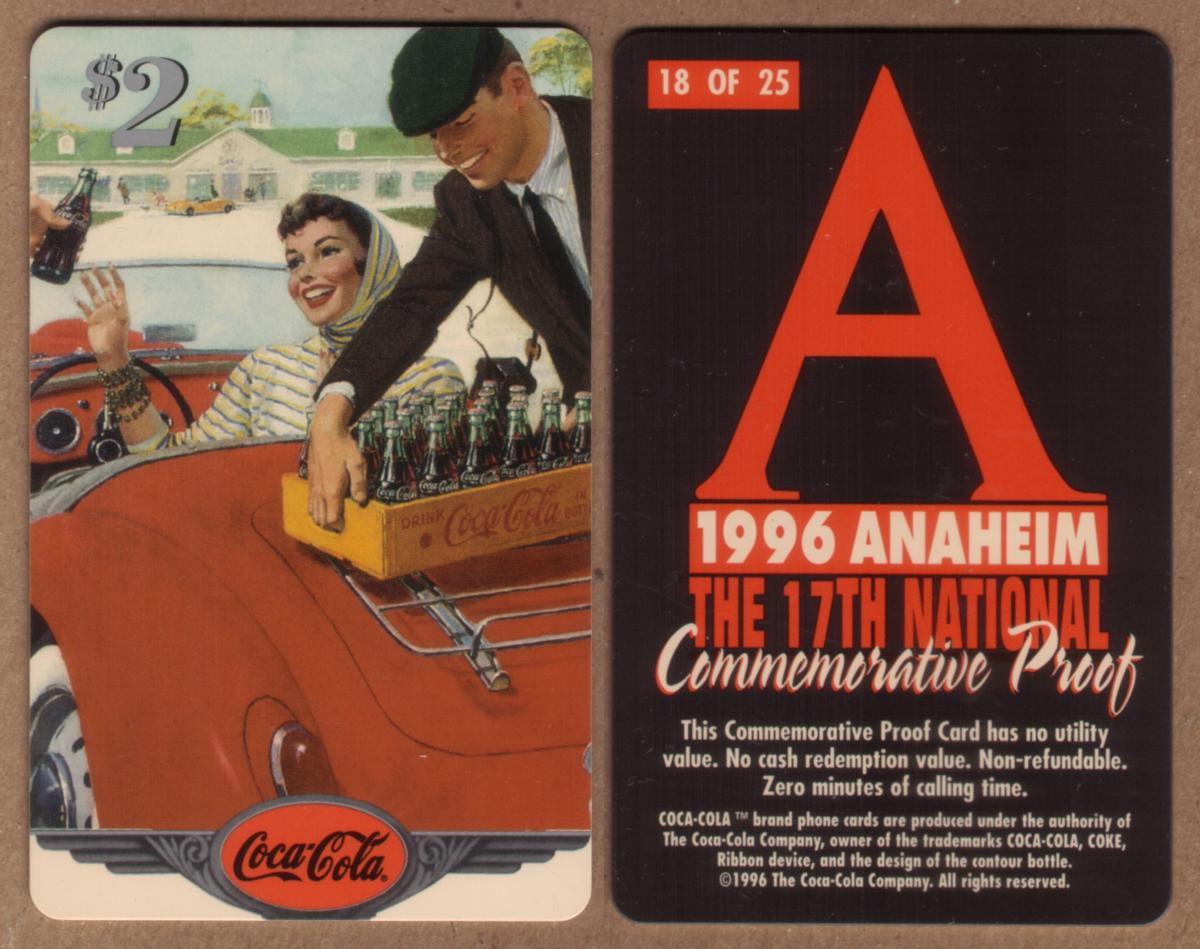 Overall, the card showcases a blend of pop culture and collectible card artistry tied directly to Coca-Cola’s 1996 Anaheim event. This item is a specific numbered proof collectible, numbered 18 out of 25 in the series, providing both historical and brand-centric visual appeal to collectors of Coca-Cola memorabilia and phone cards.