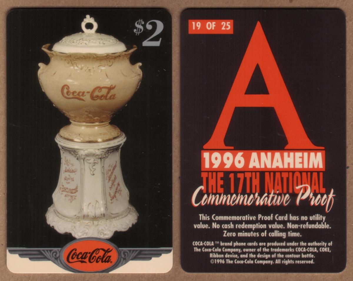 The card prominently displays logos and branding for The Coca-Cola Company, along with the Coca-Cola and Coke trademarks, reinforcing its association with the iconic beverage brand. The event name "The 17th National Commemorative Proof Coke National '96 $2" is also printed clearly, signifying the card’s official status and collectible value tied to the 1996 Anaheim gathering.