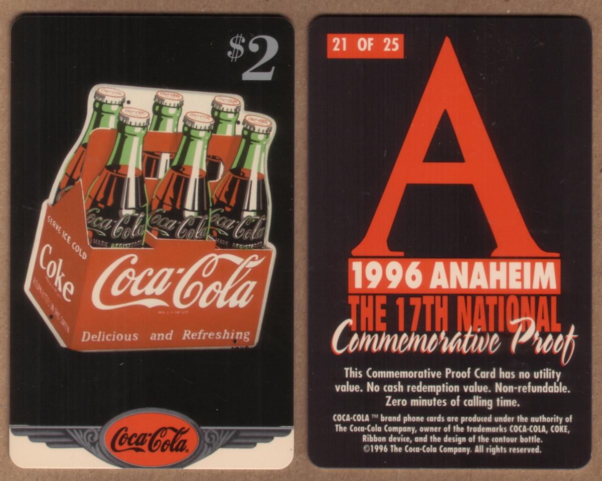 This collectible card features a design dedicated to The Coca-Cola Company, prominently displaying the brand’s logos and imagery associated with Coca-Cola. The card highlights six bottles of Coca-Cola, numbered as #21 of a limited edition series of 25. It is marked as the 17th National Commemorative Proof Coke National '96 $2 edition, a reference to the 1996 Anaheim event connected to Coca-Cola memorabilia.