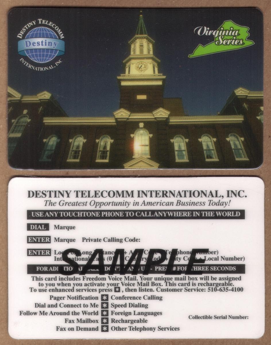 The card includes the text "Destiny Telecomm" along the left side, identifying the telecommunications company associated with the card. The American States Series: Virginia is specifically noted, highlighting the card’s place within this collection. The design emphasizes Americana architecture with a classic and stately style typical of historic government or municipal buildings.