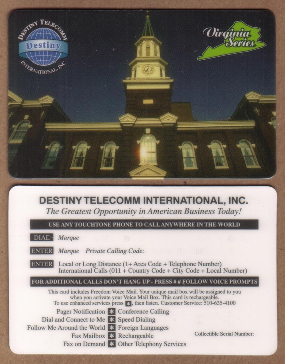 The card has printed text identifying it as part of the “americana American States Series: Virginia.” The Destiny Telecomm logo appears on the lower right corner, indicating the issuing telecommunications company. There is also a numeric value printed as “50 Units,” reflecting the card's calling credit.