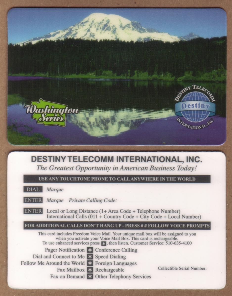 The card includes text identifying it as Washington State, with the words "Washington State Mountain, Lake & Trees" clearly visible along the bottom edge. The Destiny Telecomm logo is present in the lower left corner, indicating the card’s issuer. The overall design highlights the natural beauty of Washington State’s outdoor environment, emphasizing elements like forested areas, mountainous terrain, and water.