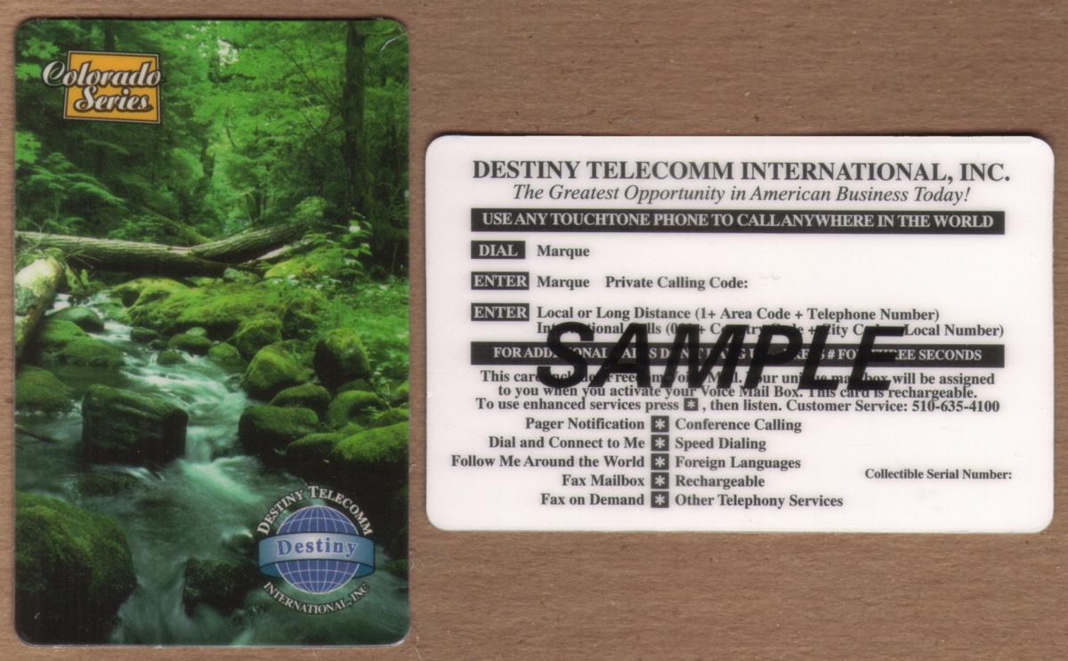 This collectible phone card combines natural imagery with branding elements related to Destiny Telecomm and the Americana theme, emphasizing Colorado’s rich forest environment and the tranquility of its flowing stream.