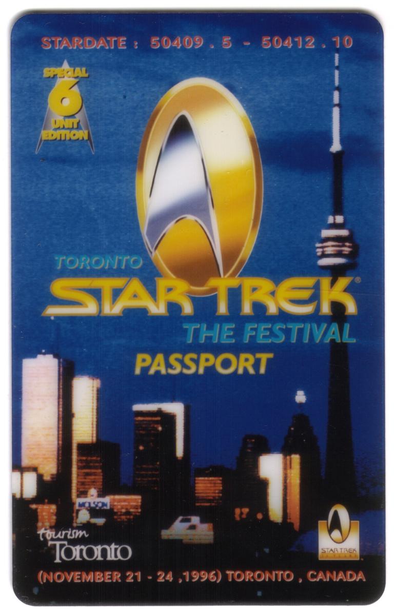 This collectible card features a promotional design for Star Trek Special Edition 6 Unit, specifically highlighting The Festival Passport for Toronto’s Star Trek event held from November 21 to 24, 1996. The card's background prominently displays a night skyline of Toronto, Canada, with the CN Tower clearly visible on the right side.