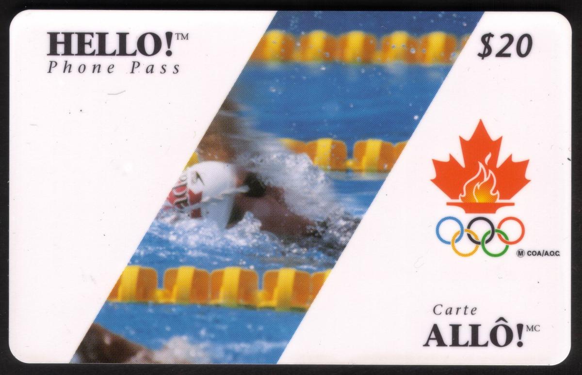 This collectible card features imagery related to the 1996 Olympic Games, specifically honoring the sport of swimming. The front displays the Canadian flag prominently, symbolizing Canada’s participation in the event. The card’s design includes a depiction of swimming as an Olympic sport, which is emphasized by the text "$20" printed on the card. The year "1996" is clearly shown, marking the Olympic Games held that year.