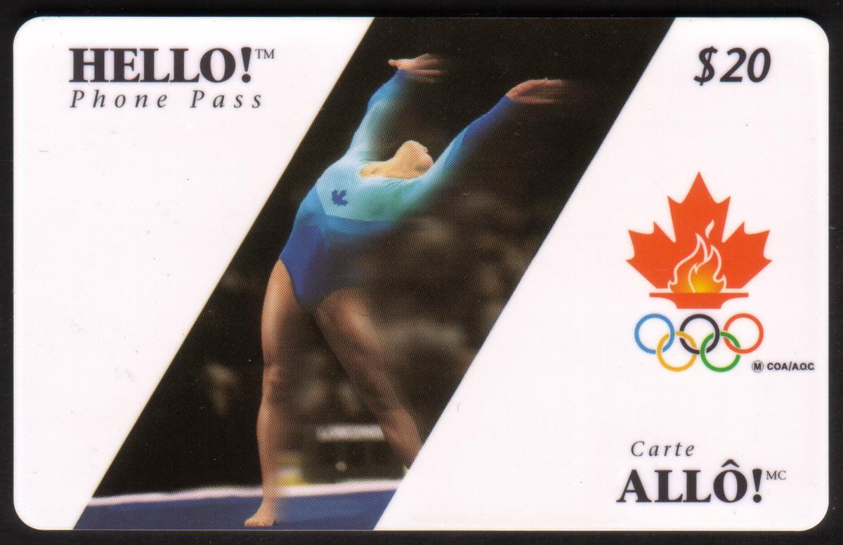 These eight collectible Hello! Phone Pass cards are part of the 1996 Olympics Sports Set issued in Canada, featuring a variety of Olympic sports. Each card displays the official Canadian Olympic logo with the maple leaf, Olympic rings, and flame symbol, along with the text "Carte ALLO! MC" and the denomination either $10 or $20.