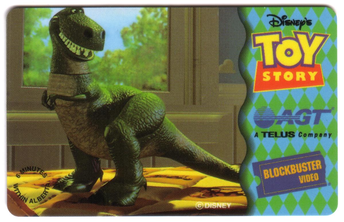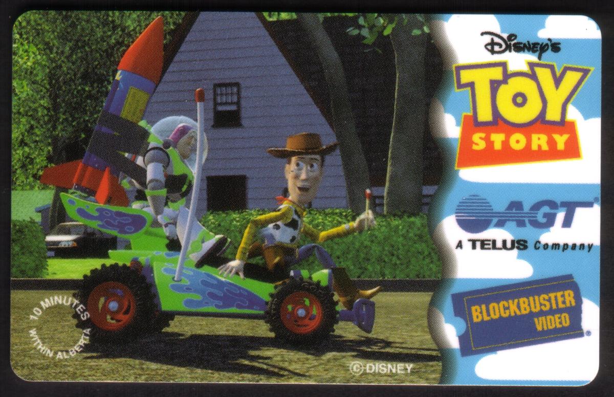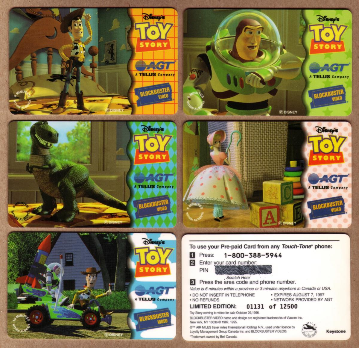The design integrates the Toy Story theme with clear, colorful representations of each character, making the set an appealing collectible for fans of the series and Disney memorabilia. The inclusion of prominent Canadian telecommunications companies emphasizes the regional origin and collectible nature of these phone cards.