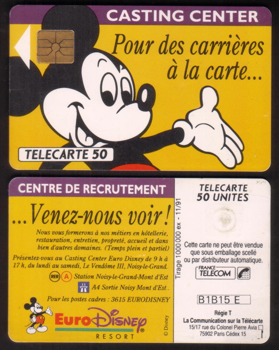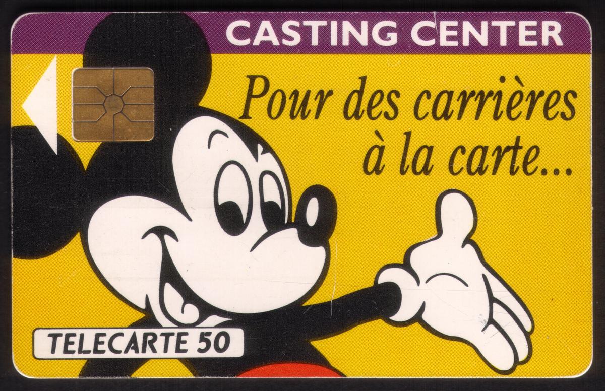 Near the bottom left, there is a white rectangular box with the text "TELECARTE 50," indicating the card’s value of 50 units. This card is associated with Euro Disney Resort in France and promotes the Mickey Mouse Casting Center. It is marked as used and is a collectible item linked to France and Euro Disney.