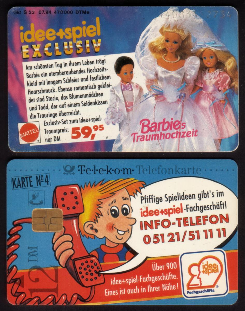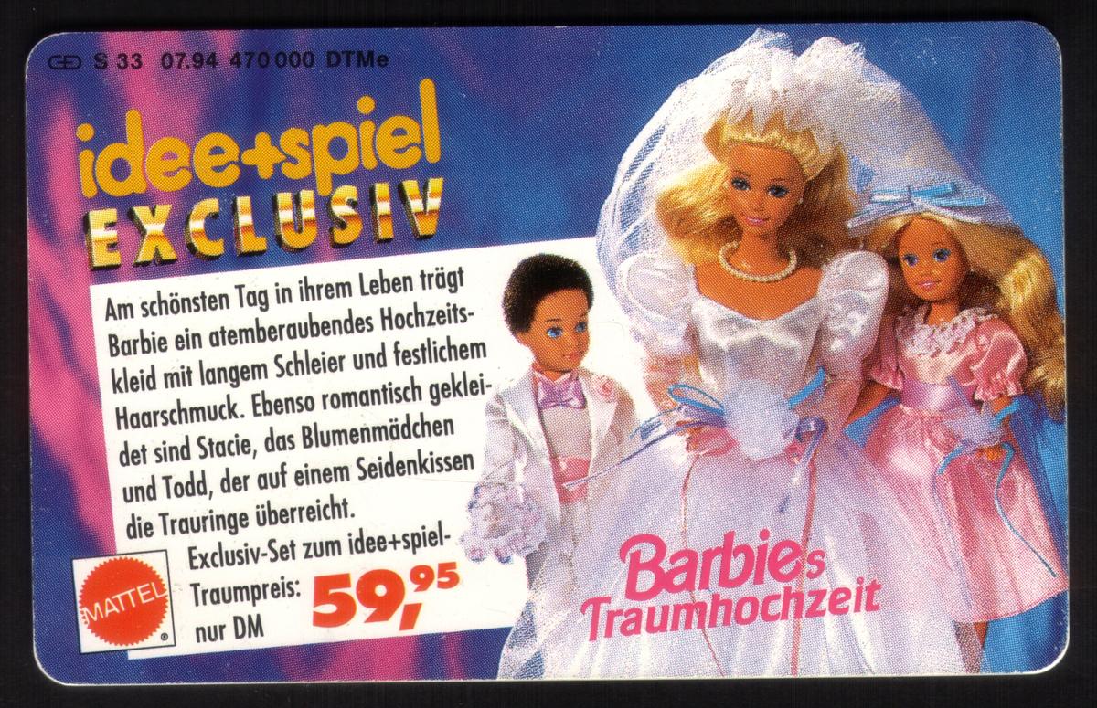 This collectible phone card from Germany features the theme "Barbie's Traumhochzeit" (Barbie's Dream Wedding) with characters from a Mattel Barbie set. The card prominently displays Barbie dressed in an elegant white wedding gown adorned with lace and a long veil. Barbie wears pearl earrings and a pearl necklace, enhancing her bridal look. Beside her are two other characters: a young girl dressed as a flower girl in a pink dress with puffed sleeves and a headpiece, and a boy dressed as a ring bearer in a white tuxedo with a pink bow tie and pink cummerbund.