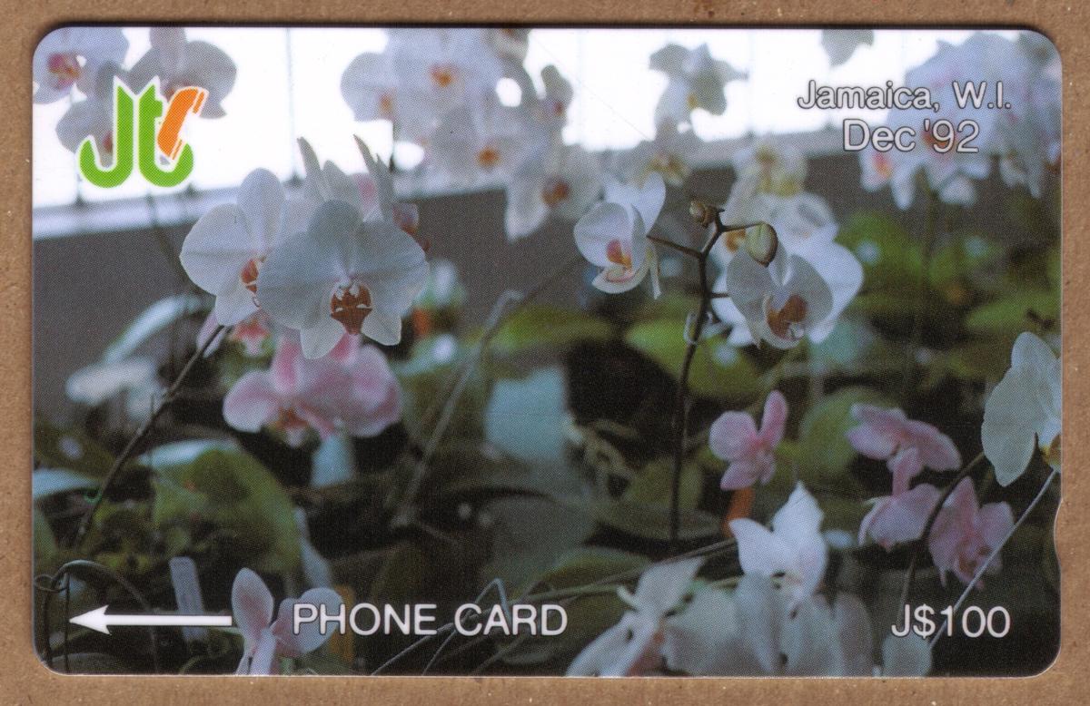 The layout includes a small golden chip embedded on the left side of the card, which is standard for phone cards used for telephone access. The card’s overall design combines natural imagery with practical information, highlighting both the floral motif and the card’s telecommunications purpose. The orchid flowers are detailed and colorful, emphasizing Jamaica’s rich floral heritage.