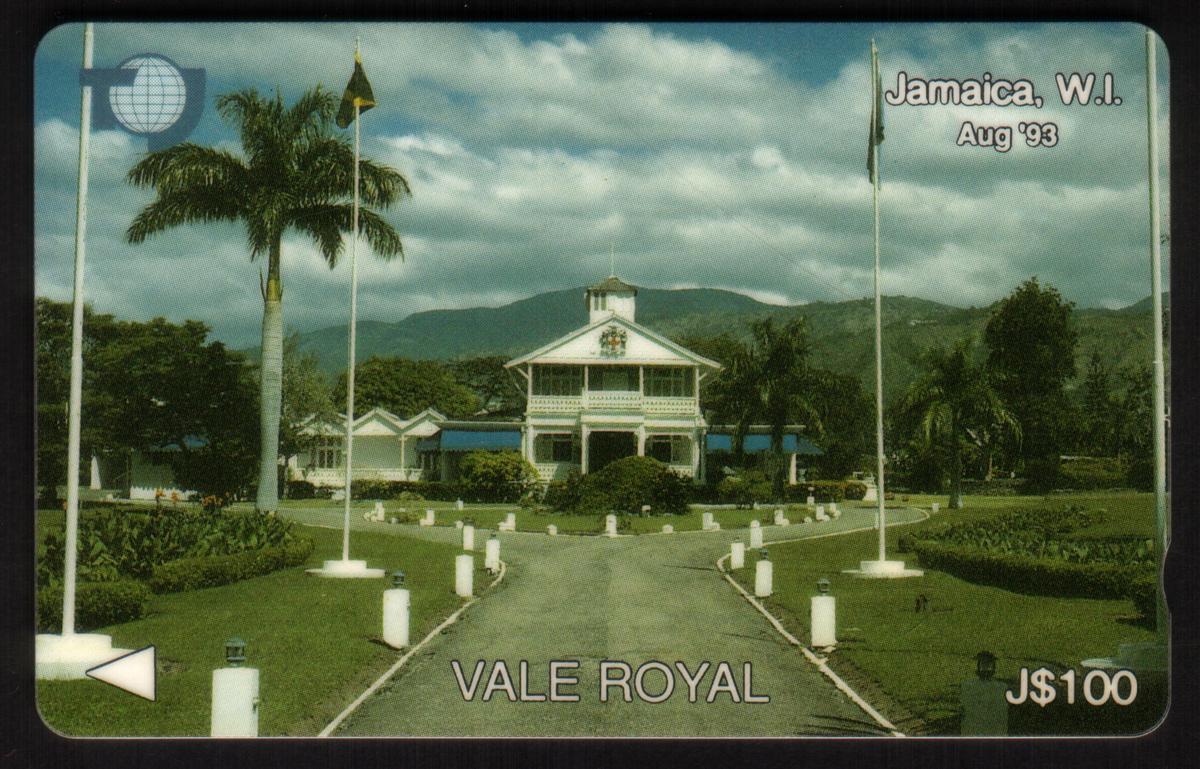 This collectible phone card from Jamaica features a denomination of J$100 and is marked as "USED." The card prominently displays the text "Vale Royal" along with the word "Jamaica" positioned on the upper section. The card's visual design includes vibrant colors with a tropical and cultural theme, reflecting elements associated with Jamaica.