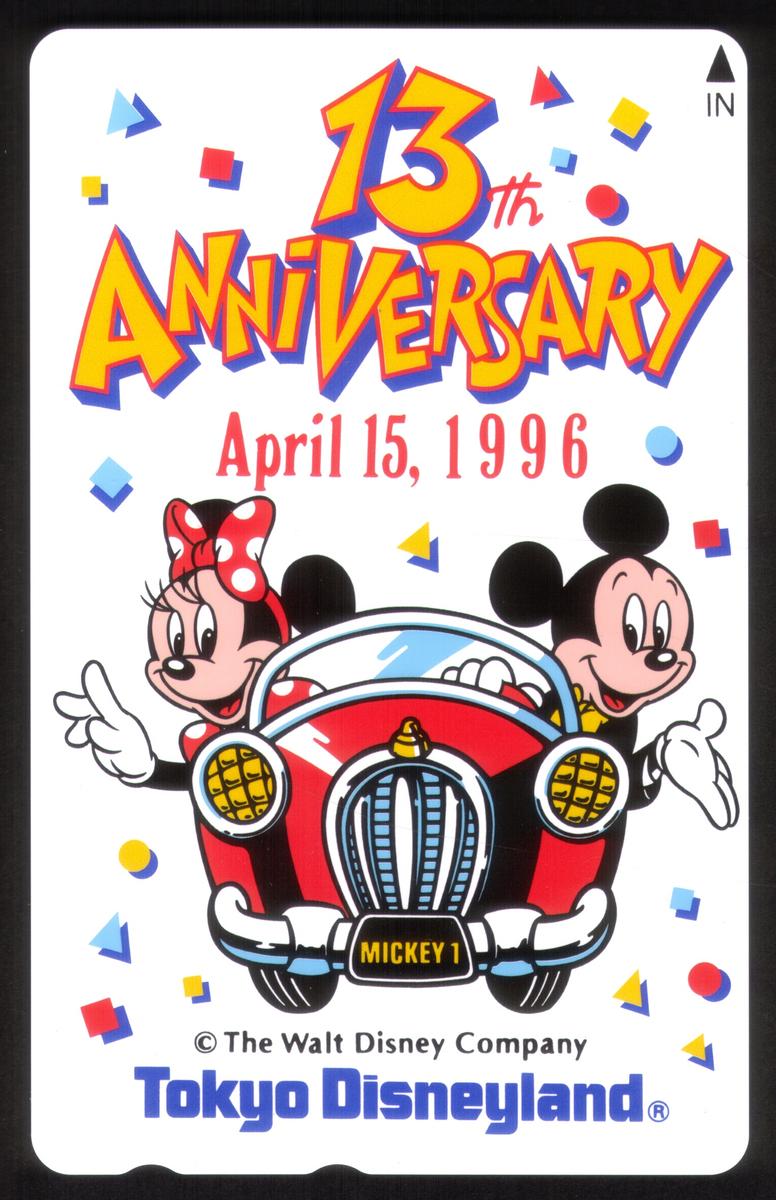 This card is a collectible item issued in Japan, associated with Disney and Tokyo Disneyland. It commemorates the park’s 13th anniversary and prominently features iconic Disney characters in an automobile setting. The collectible nature of the card is reinforced by its pristine condition and the detailed artwork celebrating a specific milestone event.