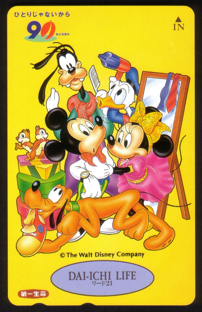 This card commemorates Disney characters including Mickey, Minnie, Goofy, Donald Duck, Pluto, Chip, and Dale. It highlights a cheerful, dynamic group scene set against a solid, bright background, emphasizing the collaborations involved with Dai-Ichi Life and Disney in Japan.