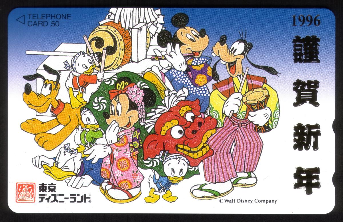 This collectible phone card features a vibrant illustration of a golden dragon intertwined with Disney characters, celebrating the 1996 New Year. The artwork prominently includes Mickey Mouse and Donald Duck, both depicted in festive attire. Mickey Mouse wears a red and gold costume with a detailed Chinese-style hat, while Donald Duck is dressed in a similar color scheme, complementing the theme of the Chinese New Year. The dragon winds dynamically across the card’s surface, symbolizing strength and good fortune.