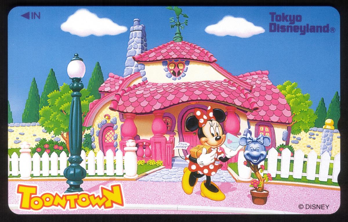 This collectible phone card features Minnie Mouse standing in front of her home in Disney ToonTown. Minnie is depicted wearing her classic red bow with white polka dots and a matching red dress. The setting includes the exterior of her quaint house, portrayed with colorful details and a welcoming appearance. The card has a bright and cheerful atmosphere consistent with Disney’s ToonTown theme.