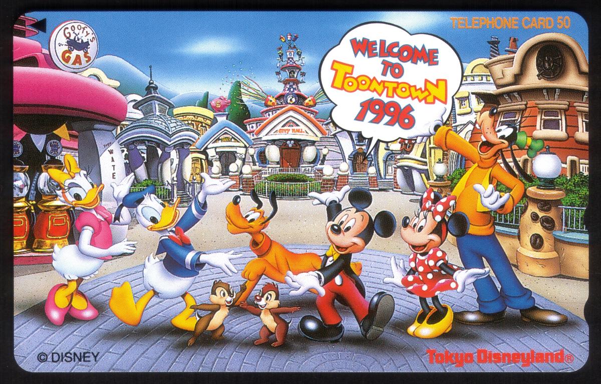Celebrate 1996 with this vibrant Disney card featuring Mickey, Minnie, Donald, Daisy, Goofy, Pluto, and Chip and Dale amid Toontown’s whimsical architecture and playful scenes. |