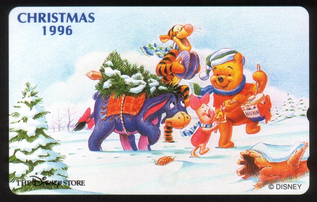 This collectible features characters from Disney’s Winnie the Pooh franchise, specifically Pooh, Tigger, Eeyore, and Piglet. The card displays these four iconic characters together, rendered in classic Disney animation style. The text on the card includes the year "1996" and "Disney Christmas," indicating a holiday-themed release. The presence of the Disney Store logo confirms its official merchandise status. The card is associated with Japan, as indicated by text referencing that location.