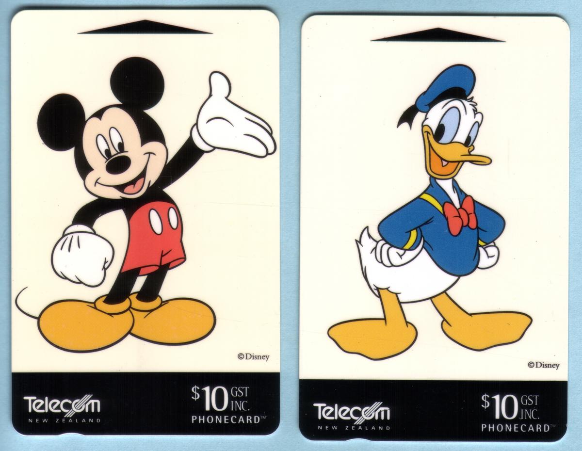Both cards showcase the characters against neutral backgrounds that enhance the visibility of Mickey and Donald without distraction. The artwork accurately reflects their signature looks: Mickey with his characteristic cheerful smile and rounded ears, and Donald with his sailor shirt and expressive demeanor. These cards come from New Zealand and are dated within a collectible phone card context, clearly emphasizing their role as a collectible collectible item related to entertainment and popular culture.