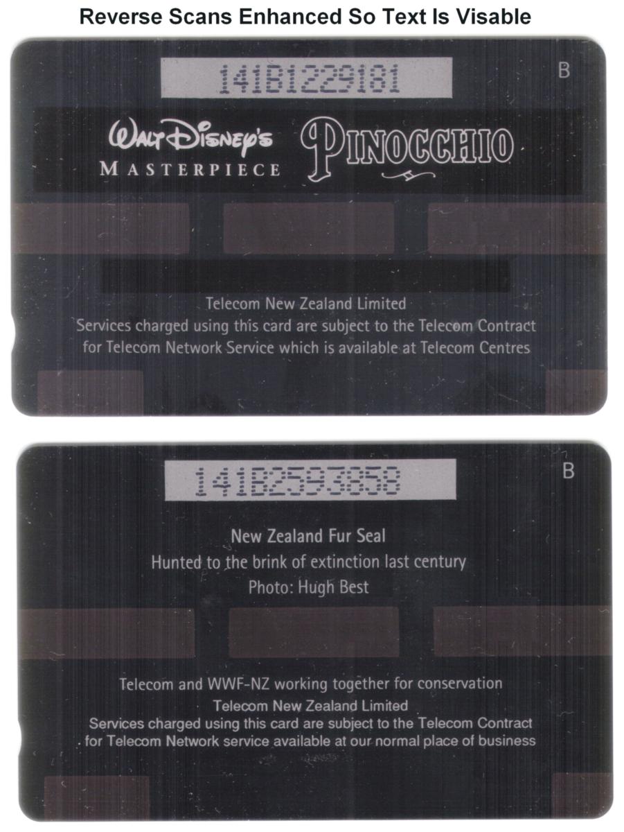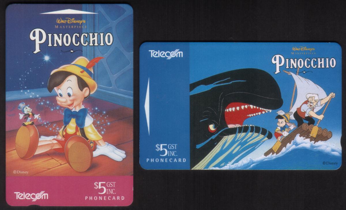 Both cards serve as collectible phone cards issued by Telecom New Zealand and highlight iconic characters and moments from Disney's *Pinocchio*. One card notably includes a rare "Fur Seal" error, adding to the set’s uniqueness and appeal for collectors.