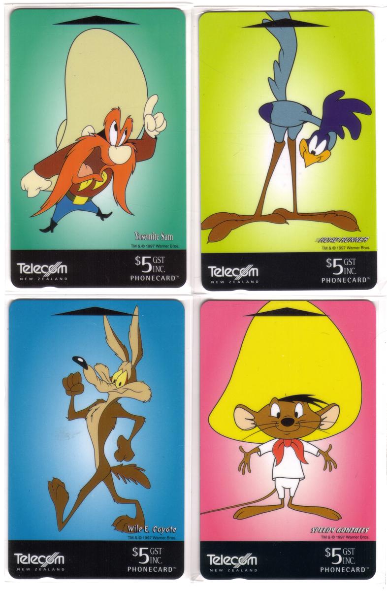 This collectible phone card from New Zealand features colorful illustrations of four iconic Looney Tunes characters: Yosemite Sam, Road Runner, Wile E. Coyote, and Speedy Gonzales. Each character is depicted in a lively, cartoon style set against vibrant backgrounds that emphasize their distinct personalities. Yosemite Sam appears prominently, showcasing his trademark red mustache and cowboy hat. Road Runner is shown in motion with dynamic lines highlighting his speed, while Wile E. Coyote stands ready with a determined expression. Speedy Gonzales, known for his quickness, is also featured in his classic outfit with a yellow sombrero.