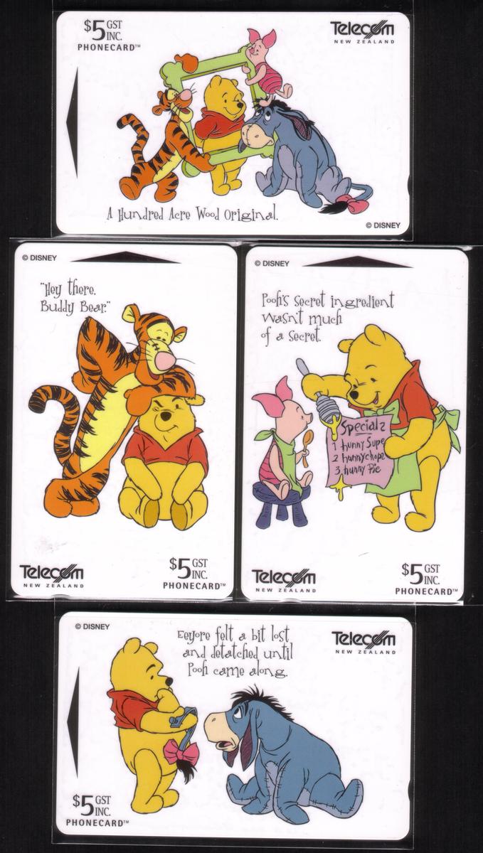 The phone cards are issued in New Zealand and are part of a collection that celebrates Disney's Winnie the Pooh. This set is identified as "Tigger, Eeyore, Piglet, Winnie the Pooh (Part 1) Set of 4," clearly presenting these four characters together. The text on the cards includes both the character names and "Disney" branding, confirming their official licensing. The images convey a sense of warmth and fun that appeals to fans of the classic Disney franchise.