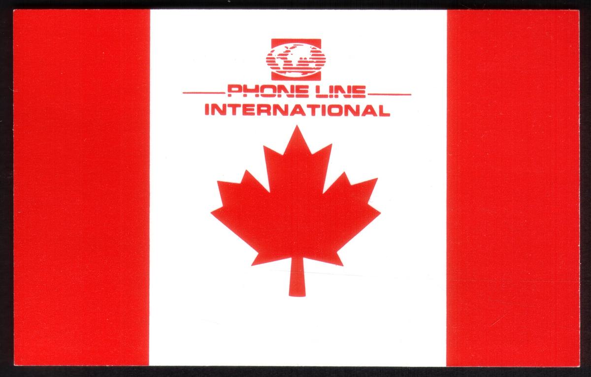 This collectible phone card features the Canadian national flag prominently displayed across its front. The flag consists of two vertical red bands on the left and right sides, with a white square in the center showcasing a single red maple leaf. Above the maple leaf, the card includes the "PHONE LINE INTERNATIONAL" logo and text in red. The logo is composed of a circular symbol with lines beneath it, followed by the brand name in uppercase letters.