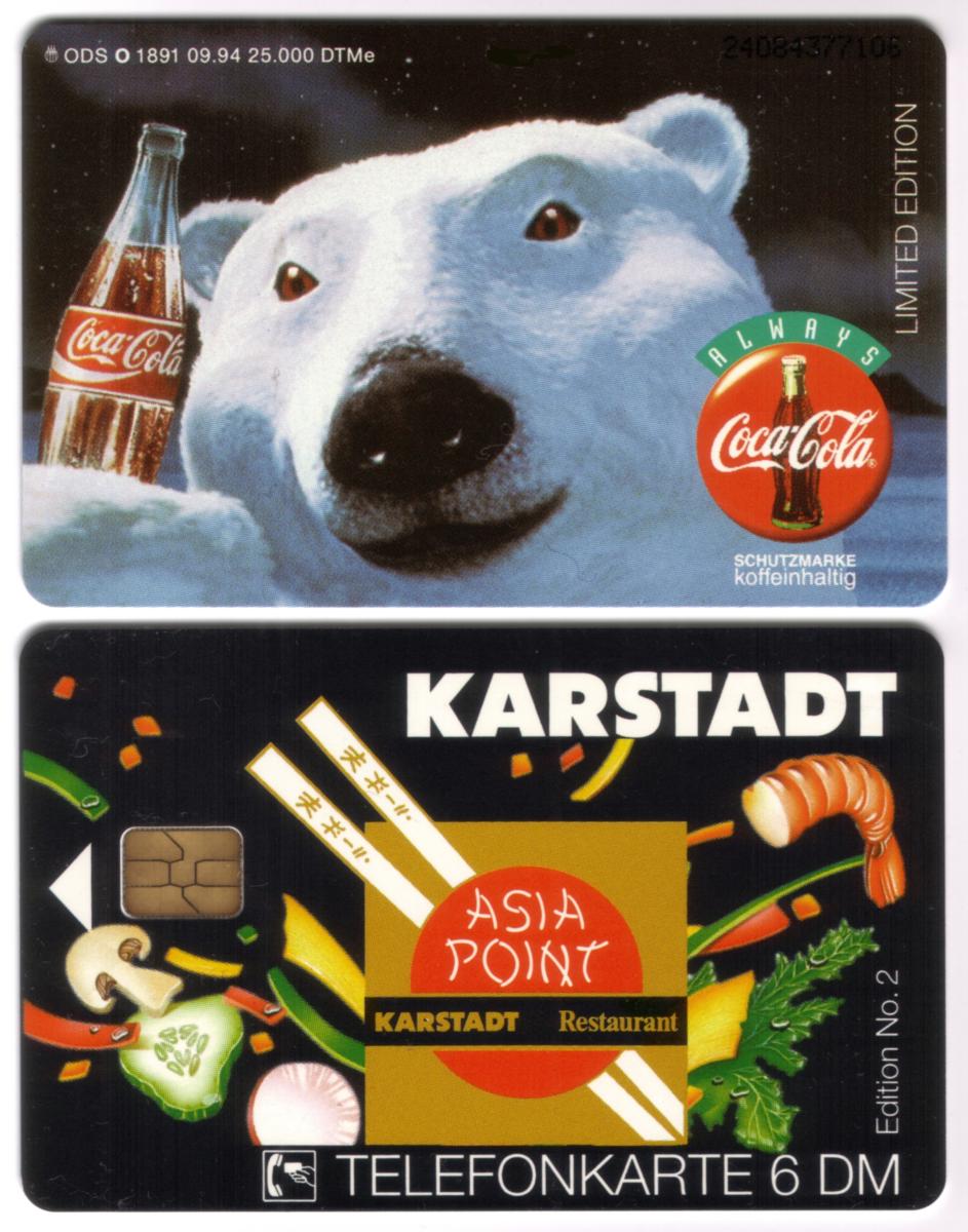 Discover vintage 1994 German phone cards featuring Coca-Cola''s polar bear and Karstadt Asia Point, blending nostalgia, culture, and vibrant design. |