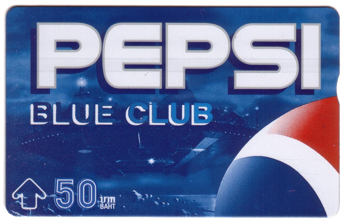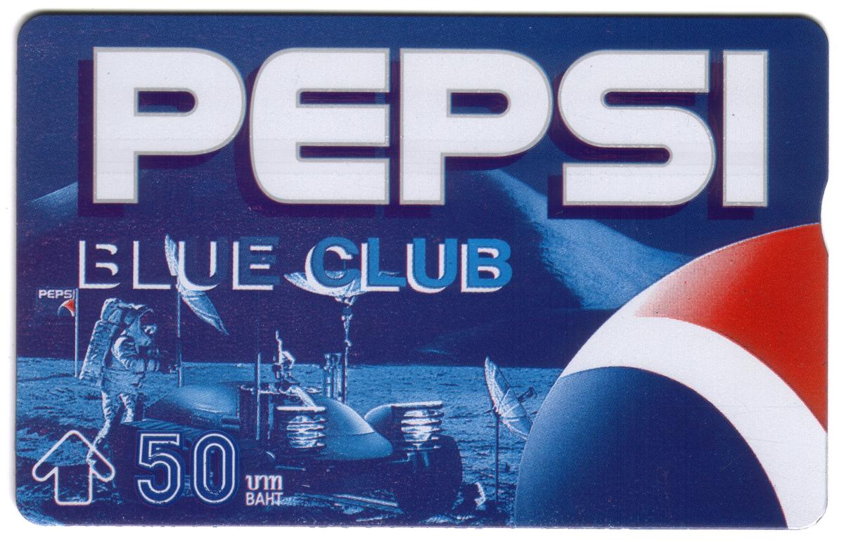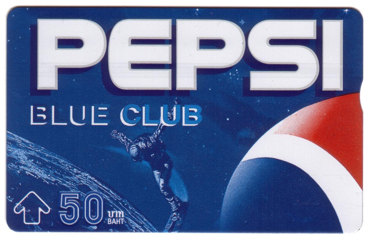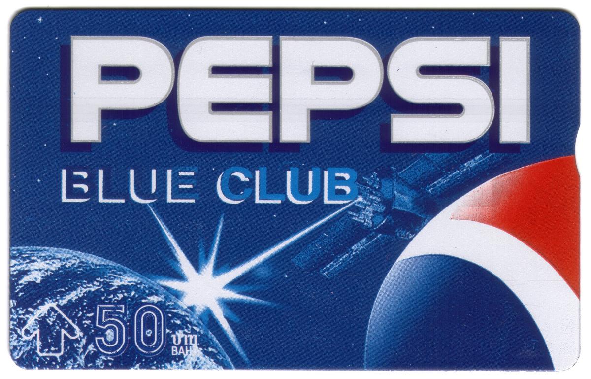 These collectible phone cards from Thailand feature the "PEPSI BLUE CLUB" branding prominently at the top in large white letters with a blue outline. Each card has a space or outer space theme, integrating Pepsiās iconic red, white, and blue logo prominently on the right edge. The denomination of 50 Baht is displayed on the lower left corner, alongside a white arrow symbol and text in Thai script.