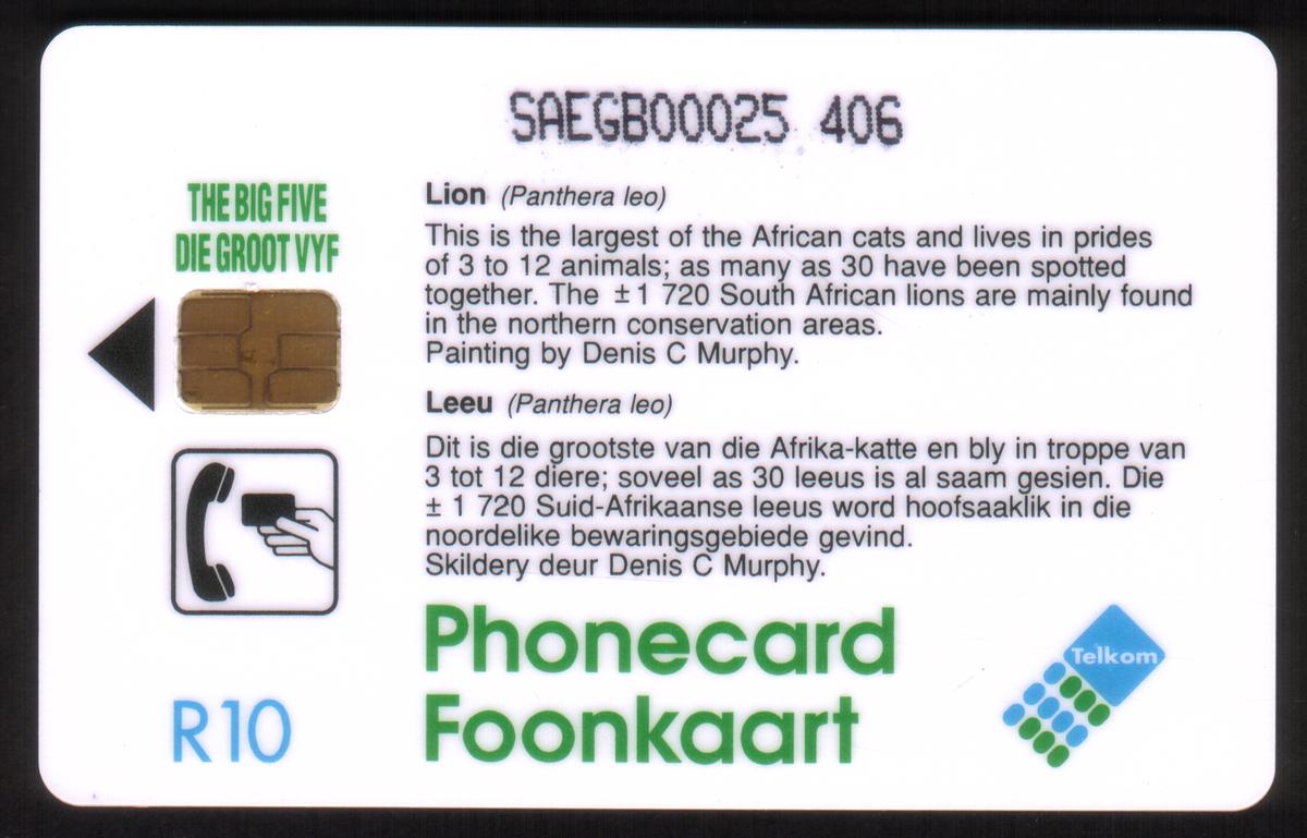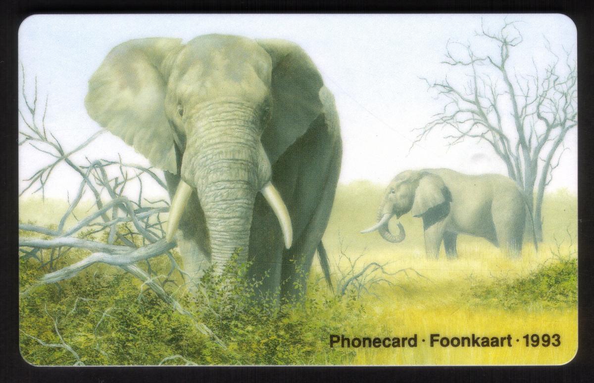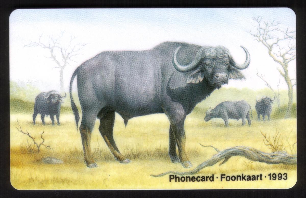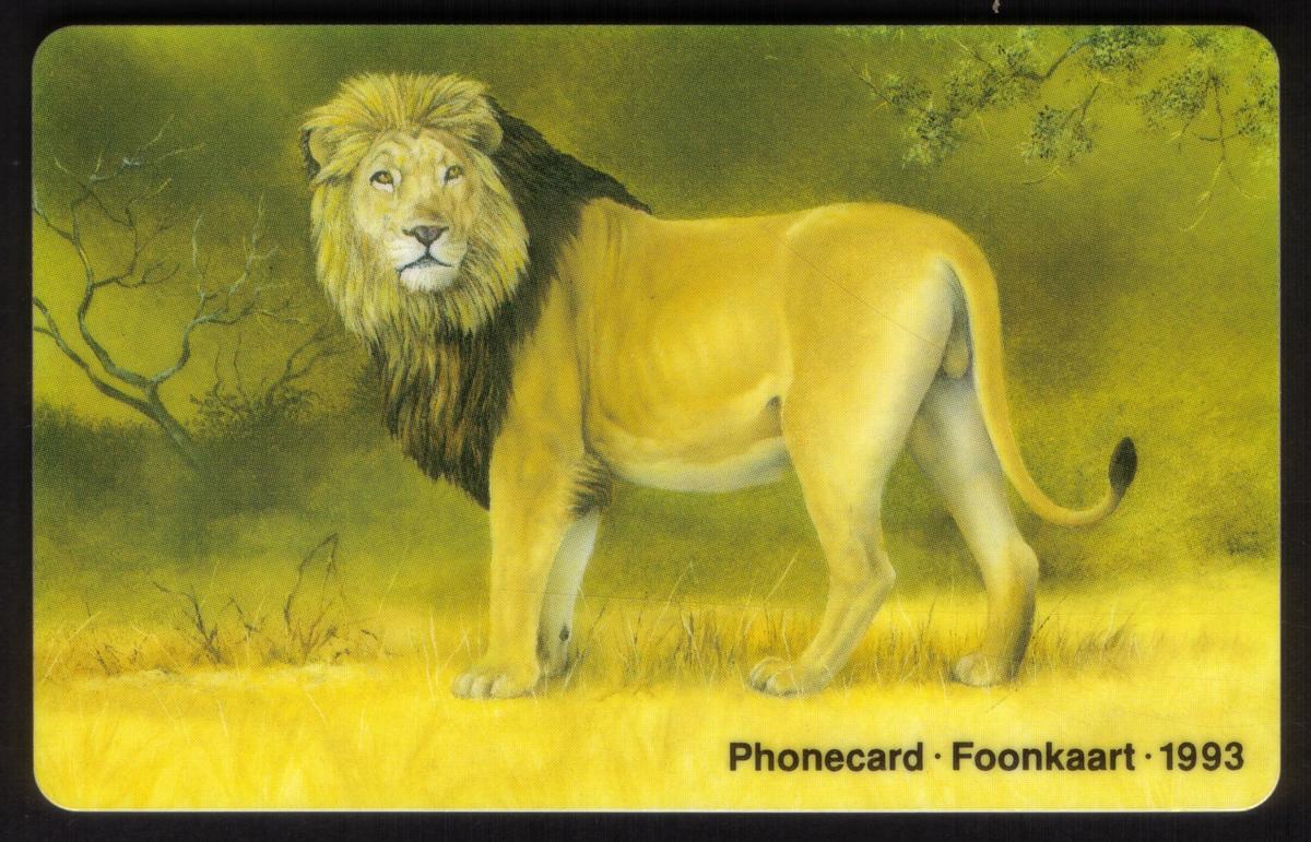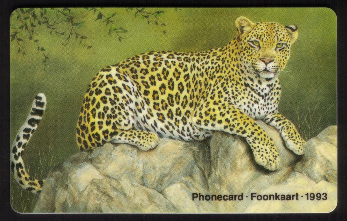 This set of five collectible phonecards, dated 1993, features detailed and artistically rendered images of animals known as the Big Five, native to South Africa. Each card displays one of these iconic species in a naturalistic setting, surrounded by vegetation and landscape elements that emphasize their habitat.