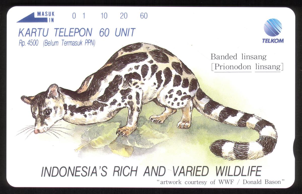 The card includes the World Wildlife Fund (WWF) logo, indicating it is part of a WWF-related series focusing on wildlife conservation and awareness. The name Donald Bason appears on the card, identifying him as the artist responsible for the artwork. Text on the card indicates the country of issue as Indonesia, and the card’s value is marked as 60 units (60u), consistent with collectible chip cards produced for wildlife-themed series.