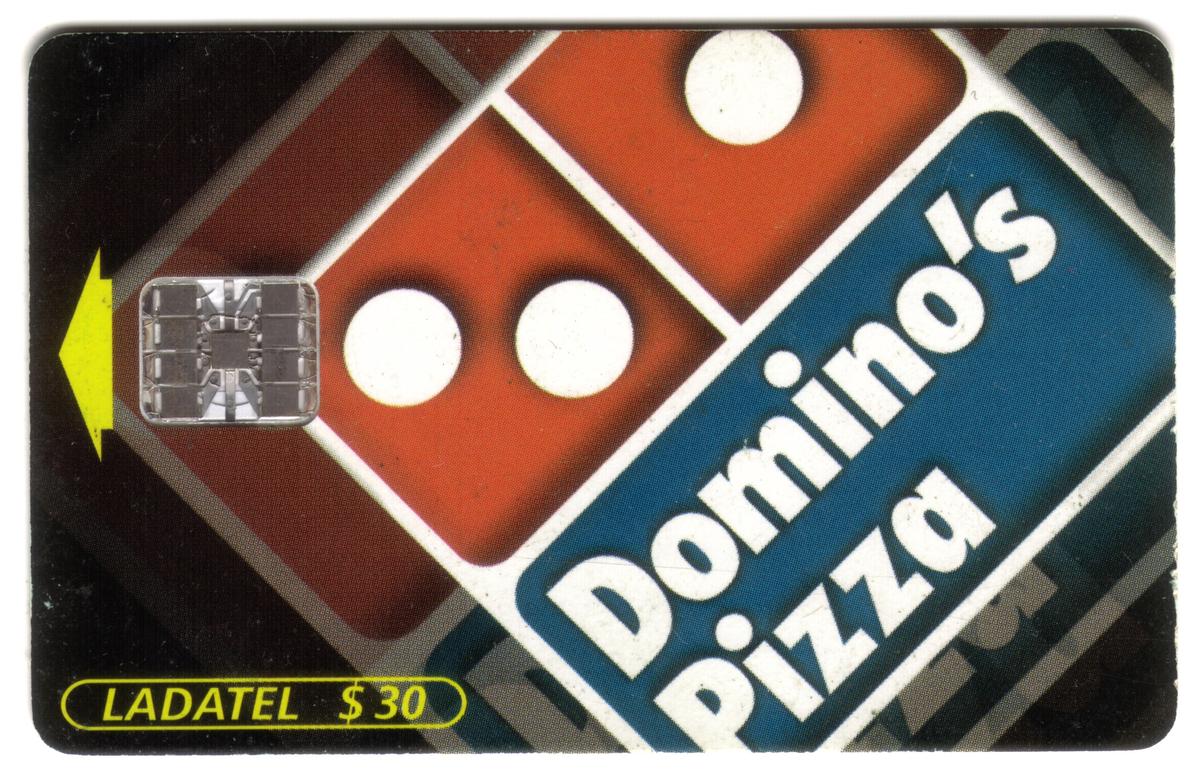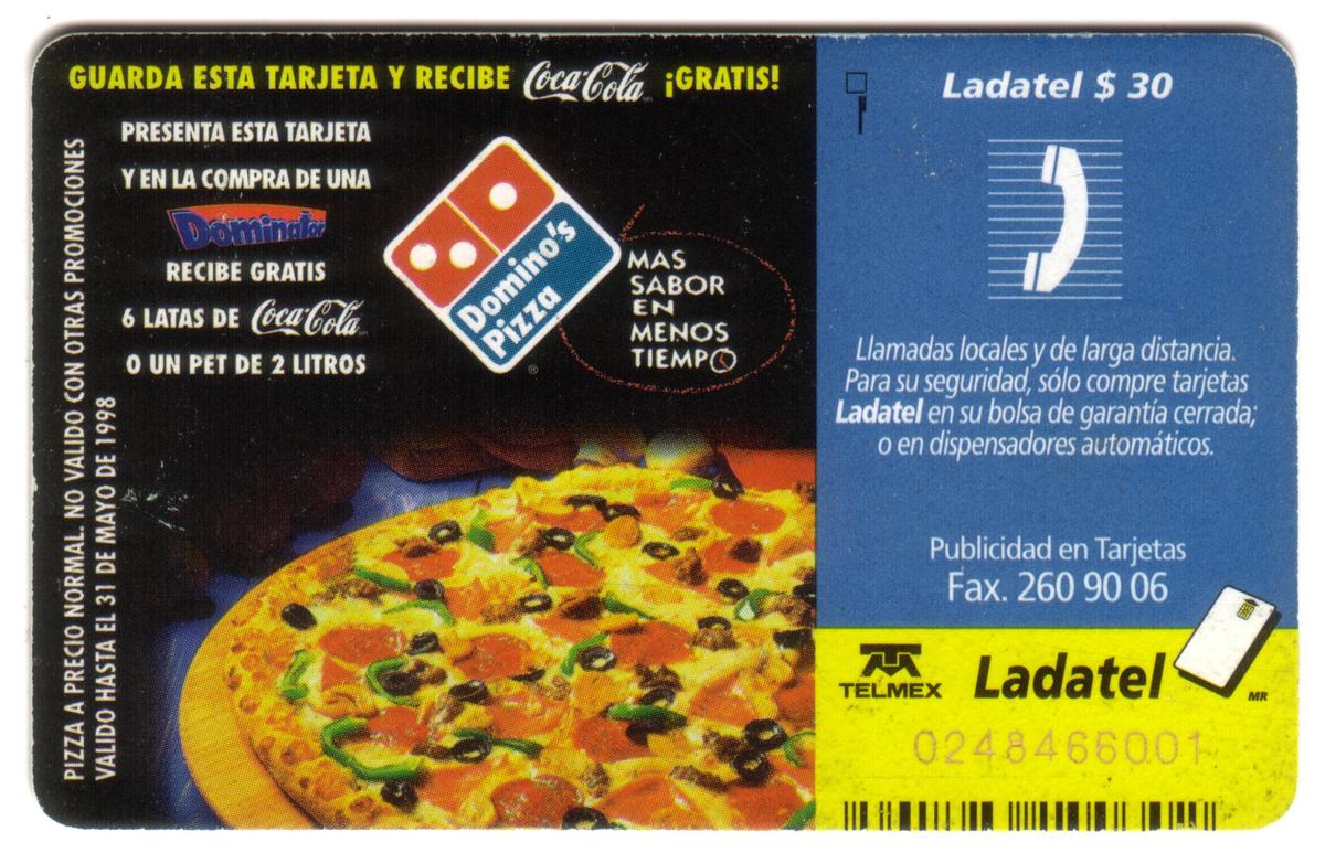 This card is a used collectible phone card produced by Ladatel in Mexico, designed with clear branding by Domino’s Pizza and Coca-Cola logos referenced in the keywords. It measures the value of $30 for phone use.