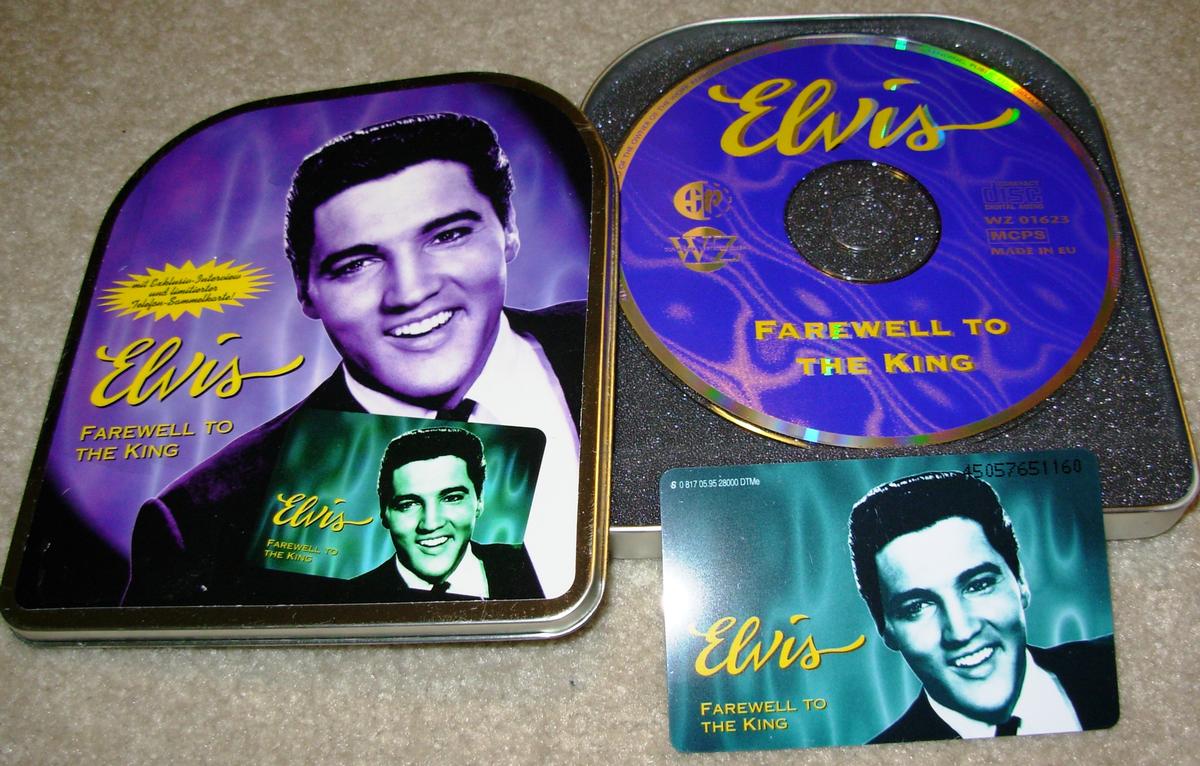 This item is a collectible set from Germany featuring Elvis Presley with the title "Farewell To The King." The set includes a dented metal container with a purple and black color scheme. On the front of the container is a prominent black-and-white portrait of a young Elvis Presley smiling, accompanied by the text "Elvis Farewell To The King" in bright yellow letters. A small graphic of a phone card featuring the same image of Elvis Presley appears in the lower right corner of the container's design.