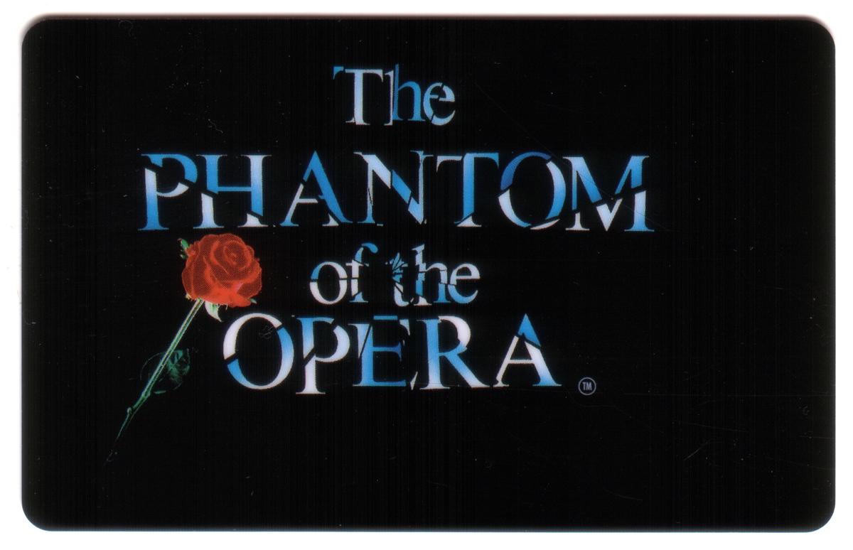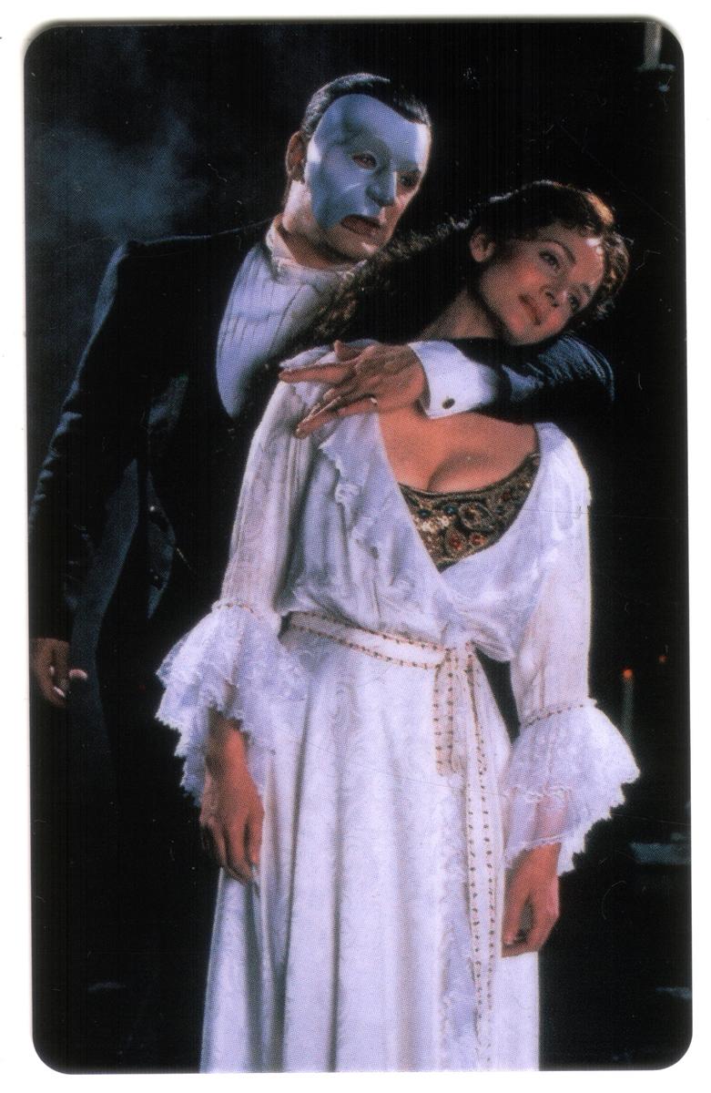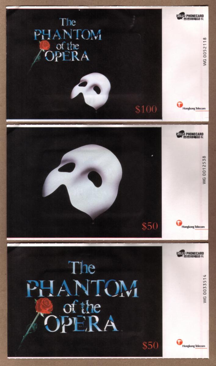The phone cards have values of 50 and 100 Hong Kong dollars, as indicated by the printed denominations on the cards. The text on the cards includes "Hongkong Telecom," identifying the issuing company, along with references to the production and its theatrical nature through words like "theater" and “production.” The overall design and layout incorporate elements that emphasize the cultural and entertainment context of the Phantom of the Opera.