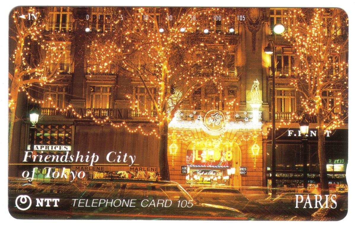 This collectible phone card from Japan features a vibrant design symbolizing friendship between Tokyo and Paris. The card's artwork highlights a festive holiday theme with illuminated lights celebrating the season. In the foreground, stylized landmarks from both cities are depicted, capturing the spirit of international goodwill and celebration. The text "Friendship City of Tokyo - Paris France Holiday Lights" is clearly printed on the card, confirming the connection between the two cities and the theme of holiday illumination.
