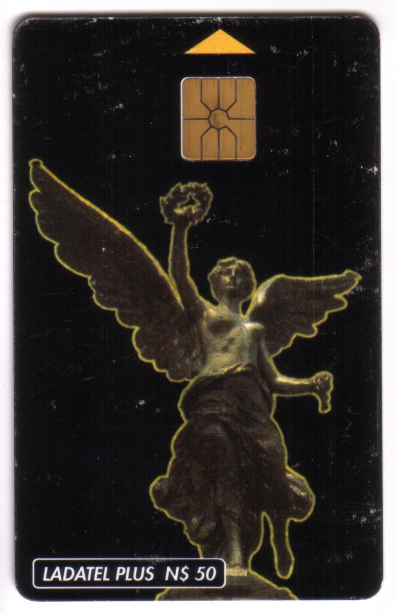 This collectible telephone card from Mexico features a detailed image of the Winged Liberty Angel, also known as the "Angel of Independence" statue situated in Mexico City. The statue depicts a winged female figure holding a laurel wreath in her raised right hand and broken chains in her left hand, symbolizing victory and freedom. The angel is rendered in a gold outline against a solid black background, creating a striking contrast.