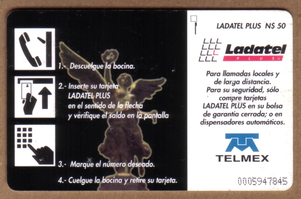 The card is marked with "LADATEL PLUS" and "N$ 50" near the bottom left corner, indicating its value of 50 Nuevo Pesos and its affiliation with Ladatel, a Mexican telecom service. The card includes a visible gold chip near the top center, used for telephone operation.